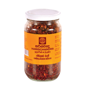 If you wish to add a spicy bite to an otherwise basic meal, Harischandra Umbalaka Badum Pickle is bound to stir up a succulent storm. The combination of Maldive fish, onions, chillies, garlic, salt, spices and oil will leave the palette titillating with unbridled flavour, tickling your taste buds with delirium.